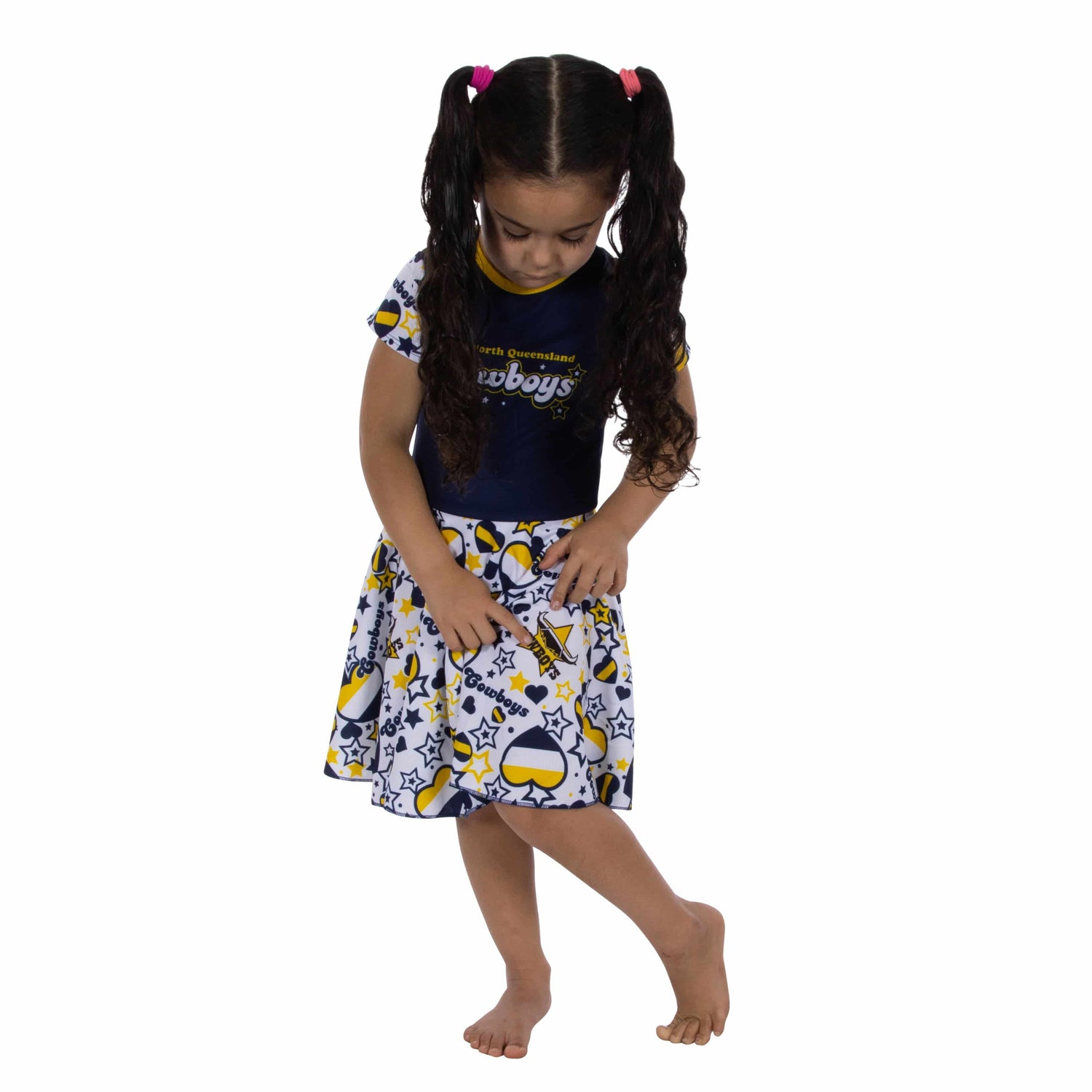 Our super cute NRL Cowboys 'Heartbreaker' Dress has a "stars & hearts" pattern interspersed with team logos. Fully dye-sublimated giving rich and true club colours; round neck; and short sleeves.
